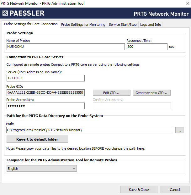 Click Save & Close to confirm your settings and to (re)start the PRTG probe service.