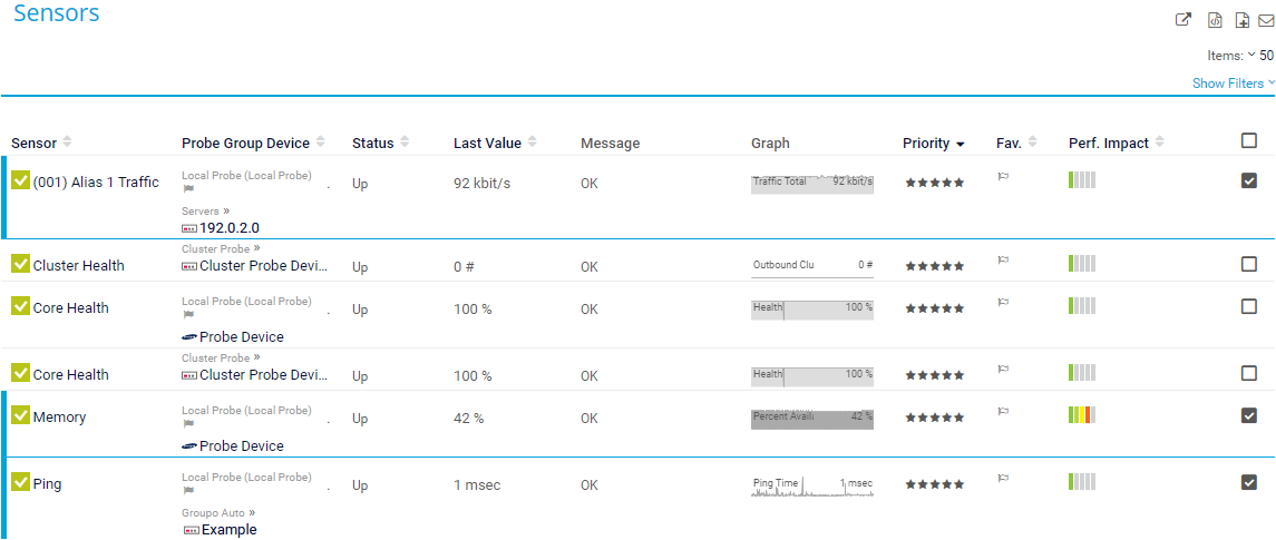 Table lists offer the multi-edit feature. With this, you can bulk edit the properties of many objects. Multi-edit is also available on the Management tab of probes or groups when you hold down the Ctrl key to select multiple objects. See also section Manage Device Tree.