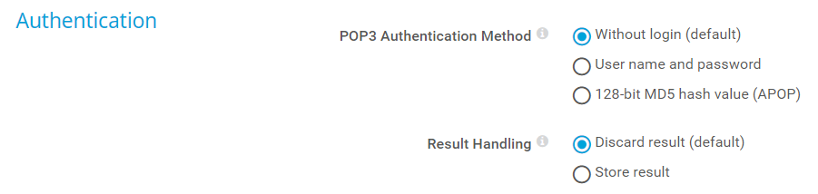 This setting is only visible if you select User name and password or 128-bit MD5 hash value (APOP) above.